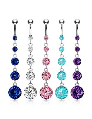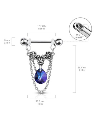 Piercing de type barbell pour le téton, en acier chirurgical 316L, avec un pendentif représentant des chaines, trois fleurs, ainsi qu'un cristal en forme de poire, de couleur turquoise.