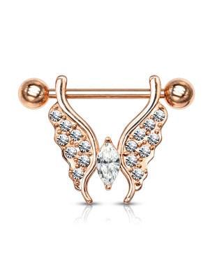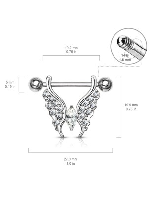 Piercing de type barbell pour le téton, en acier chirurgical 316L, avec un pendentif représentant un papillon serti de multiples petits cristaux de couleur blanche.