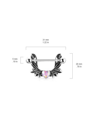 Piercing de type barbell pour le téton, en acier chirurgical 316L, avec un pendentif représentant des ailes d'ange serti d'un cristal en forme de coeur de couleur aurore boréale.