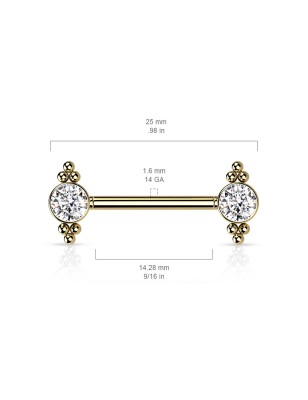 Piercing barbell en acier chirurgical 316L, plaqué de couleur dorée et avec deux embouts sertis d'une pierre en zirconium blanc entourée de billes.
