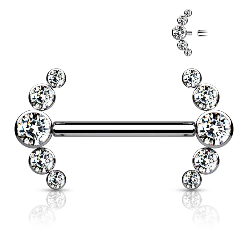 Piercing pour le téton, entièrement réalisé en titane de grade ASTM F-136, avec embouts à vissage interne de forme incurvée serties de pierres en zirconium couleur blanche.