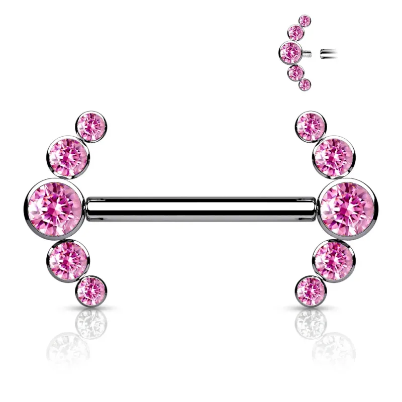 Piercing pour le téton, entièrement réalisé en titane de grade ASTM F-136, avec embouts à vissage interne de forme incurvée serties de pierres en zirconium couleur rose.