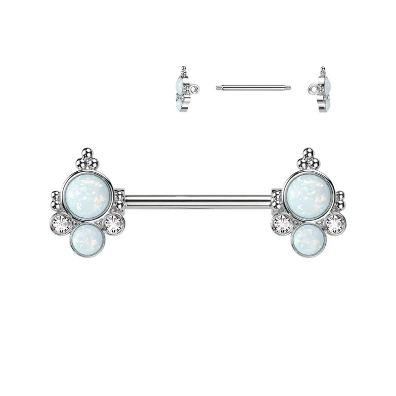 Piercing pour le téton, en acier chirurgical 316L, avec embouts sertis de deux pierres en opale de synthèse.
