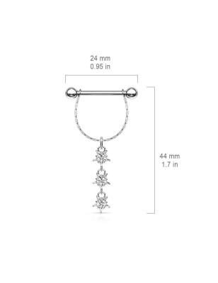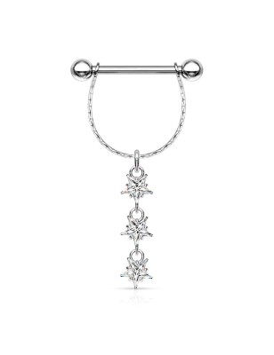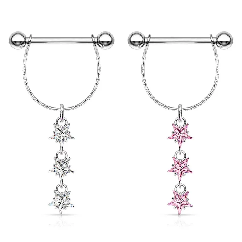 Piercing bouclier pour téton avec pendentif serti de trois strass en forme d'étoiles.