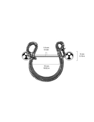 Piercing pour le téton en acier chirurgical 316L, formé d'une barbell et d'un bouclier, représentant un serpent s'enroulant autour de la barre.