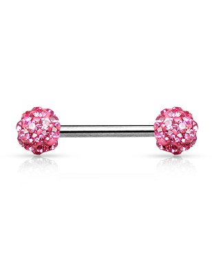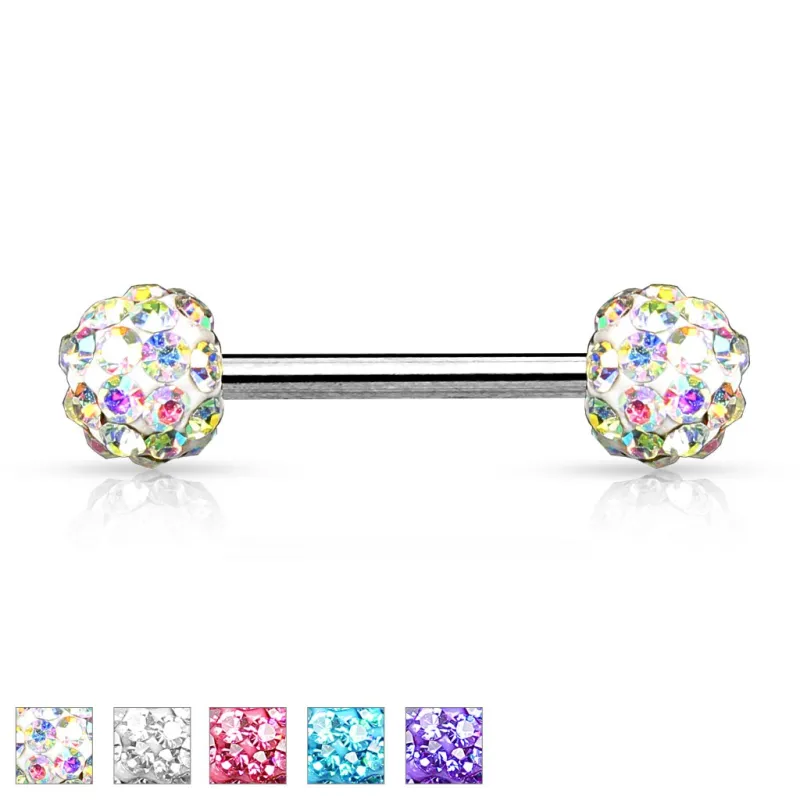 Piercing de type barbell pour le téton, en acier chirurgical 316L, avec deux boules serties de multiples petits cristaux.