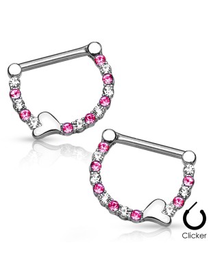 Paire de piercing pour le téton, sertis de gemmes clairs et roses, et représentant un coeur.