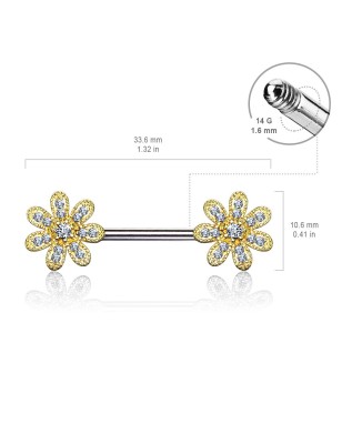 Piercing de type barbell pour le téton, en acier chirurgical 316L, représentant deux fleurs plaqué or chacune sertie de pierres en zirconium blanc.