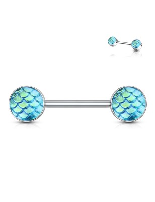Piercing de type barbell, pour le téton, en acier chirurgical, avec motifs représentant des écailles de poisson, couleur rose.