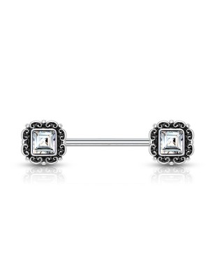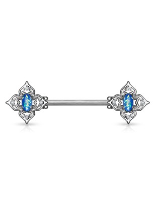 Piercing de type barbell, pour le téton, en acier chirurgical doré, avec deux motifs floral en filigrane, de forme rectangulaire, serti de petits cristaux et d'une pierre en résine imitation opale de couleur blanche.