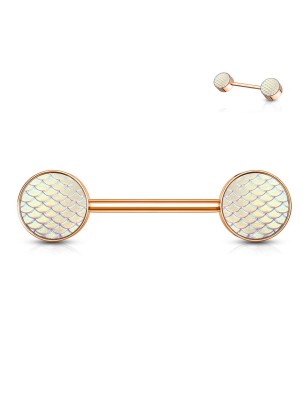 Piercing de type barbell, pour le téton, en acier chirurgical 316L, recouvert de placage PVD de couleur rosée, avec résine représentant des écailles de dragon rose.