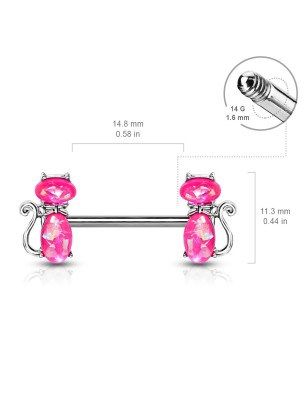Piercing de type barbell, pour le téton, en acier chirurgical 316L, représentant deux chats sertis de pierres en résine imitation opale de couleur rose.