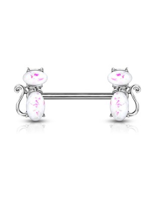 Piercing de type barbell, pour le téton, en acier chirurgical 316L, représentant deux chats sertis de pierres en résine imitation opale de couleur blanche.