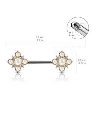 Piercing de type barbell, pour le téton, en acier chirurgical 316L, avec embouts dorés représentant des losanges avec motif floral sertis de perles et de cristaux.