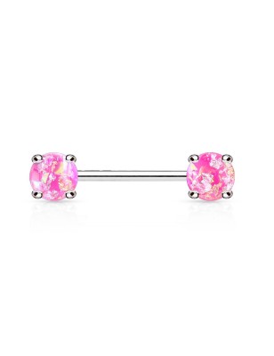 Piercing de type barbell pour le téton, en acier chirurgical 316L, serti de deux pierres en résine imitation lave, de couleur blanche.
