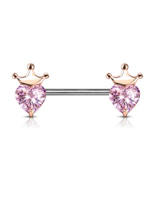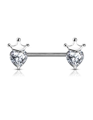 Piercing de type barbell, pour le téton, en acier chirurgical 316L, avec deux embouts serti d'une pierre en zirconium blanc en forme de coeur, surplombée d'une couronne.