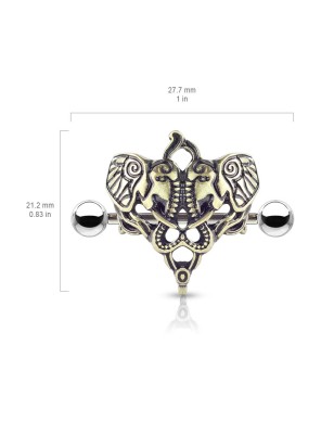 Piercing de type barbell pour le téton, en acier chirurgical 316L, avec un bouclier de couleur dorée représentant deux éléphants.