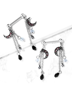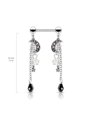 Piercing de type barbell pour le téton, en acier chirurgical 316L, avec un pendentif attaché à chaque boule, représentant des lunes, étoiles et perles noires reliées par des chaines.